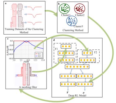 图 1 | 关系归纳神经网络架构. a, 聚类算法的数据集,即网格模型的S参数变化矩阵。B,聚类算法。C、网格化的模型和S参数矩阵训练深度强化学习模型。d,以c为输入,以动作的概率向量π和价值标量v为输出的深度强化学习模型。