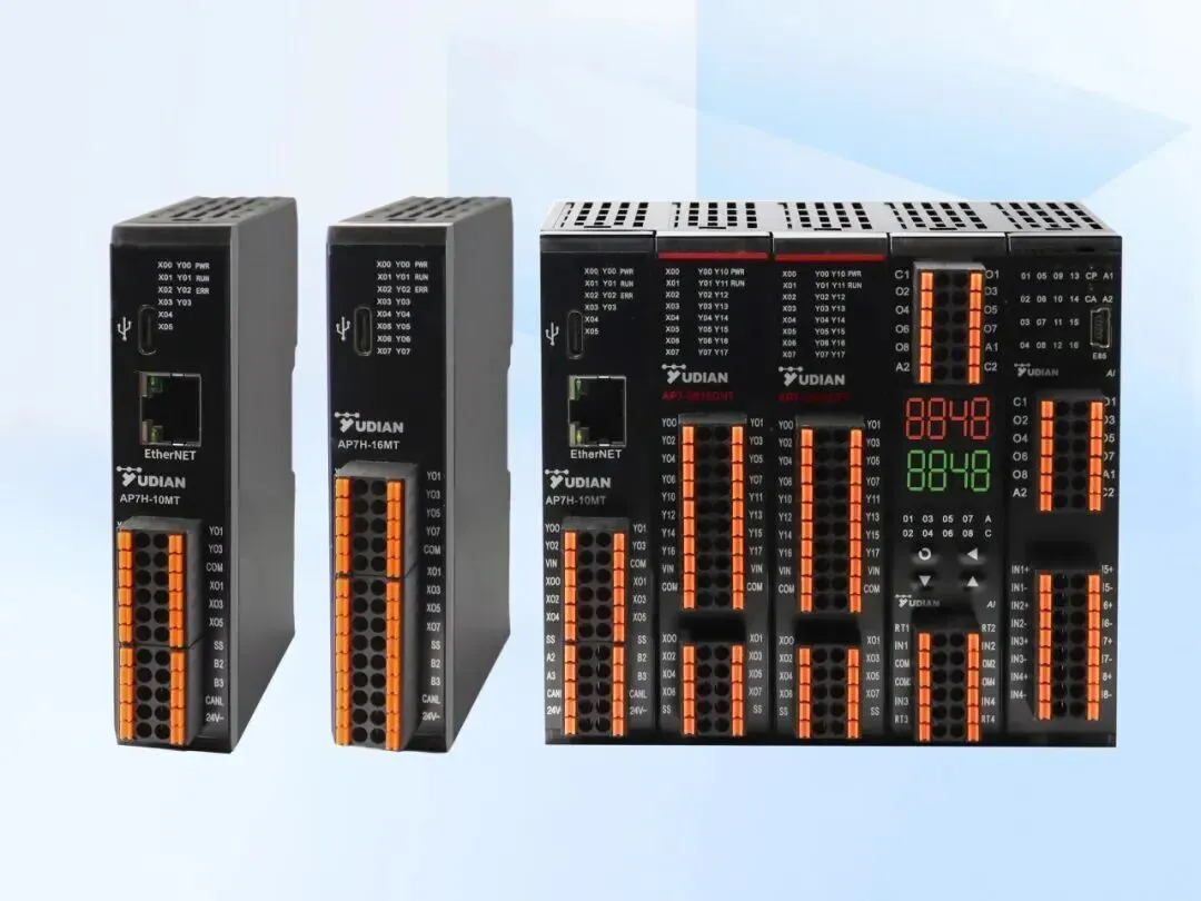 AP7系列PLC可编程控制器可直接集成宇电温控模块,无需额外网关即可实现温控与逻辑控制的统一编程、统一管理。产品采用模块化设计,支持最多5个扩展模块、120个I/O点,内置双RS485与CAN接口,兼容Modbus、CANBUS等主流协议,全系光耦隔离保障强抗干扰性能,提供256K程序容量与掉电保持寄存器,支持梯形图与C语言两种编程方式,调试便捷,系统运行稳定可靠。